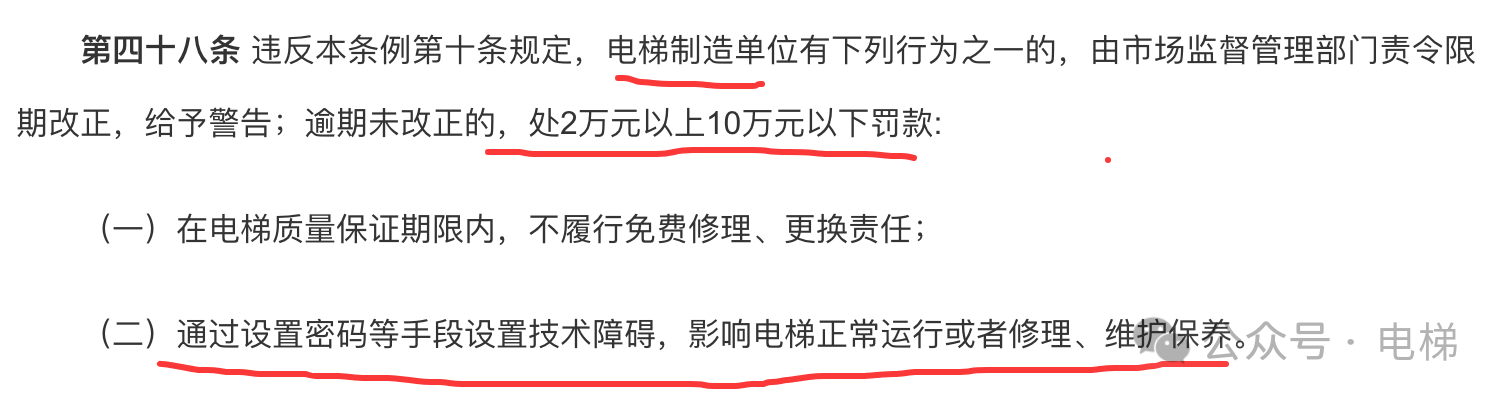 湖北近日發布了《湖北省電梯安全條例》,于2025年7月1日實施,里面規定“通過更改軟件程序、變動硬件設施、設置密碼等手段設置技術障礙,影響電梯正常運行或者修理、維護保養。”電梯公司最高可被罰款10萬元,注意,這個既包含了電梯制造單位也包含了電梯維保單位。
