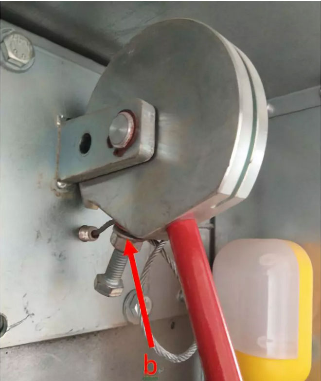 4.2)把軟軸用砂輪機從紅色箭頭a處割斷。 ![]() 4.4)參照下圖松開固定鋼絲繩的螺母,拆下控制柜一側的鋼絲繩,注意破損的鋼絲繩碎塊不要掉到控制柜里去,以免引起短路。 ![]() 4.5)抽出鋼絲繩后軟軸也就自然掉下來了,將鋼絲繩和軟軸拿到廳門外面,轉入下一工序。