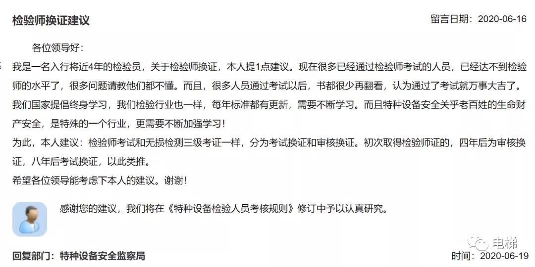 總局回復(fù):感謝您的建議,我們將在《特種設(shè)備檢驗人員考核規(guī)則》修訂中予以認(rèn)真研究。