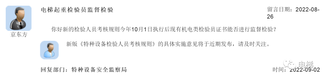 04 問:電梯起重檢驗員監督檢驗 你好新的檢驗人員考核規則今年10月1日執行后現有機電類檢驗員證書能否進行監督檢驗? 總局回復:新版《特種設備檢驗人員考核規則》的具體實施意見將于近期發布,請及時關注。